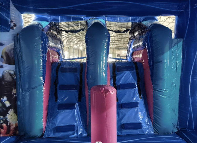 There are four activities featured in the combo –Jump area, two basketball hoops and a wall climb, leading right to the slide -allowing your guests to stay entertained and have a healthy, physical activity. Our Mermaid Bounce House with Water Slide is the best way to make any event unique, more special and to bring Under the Sea joy!